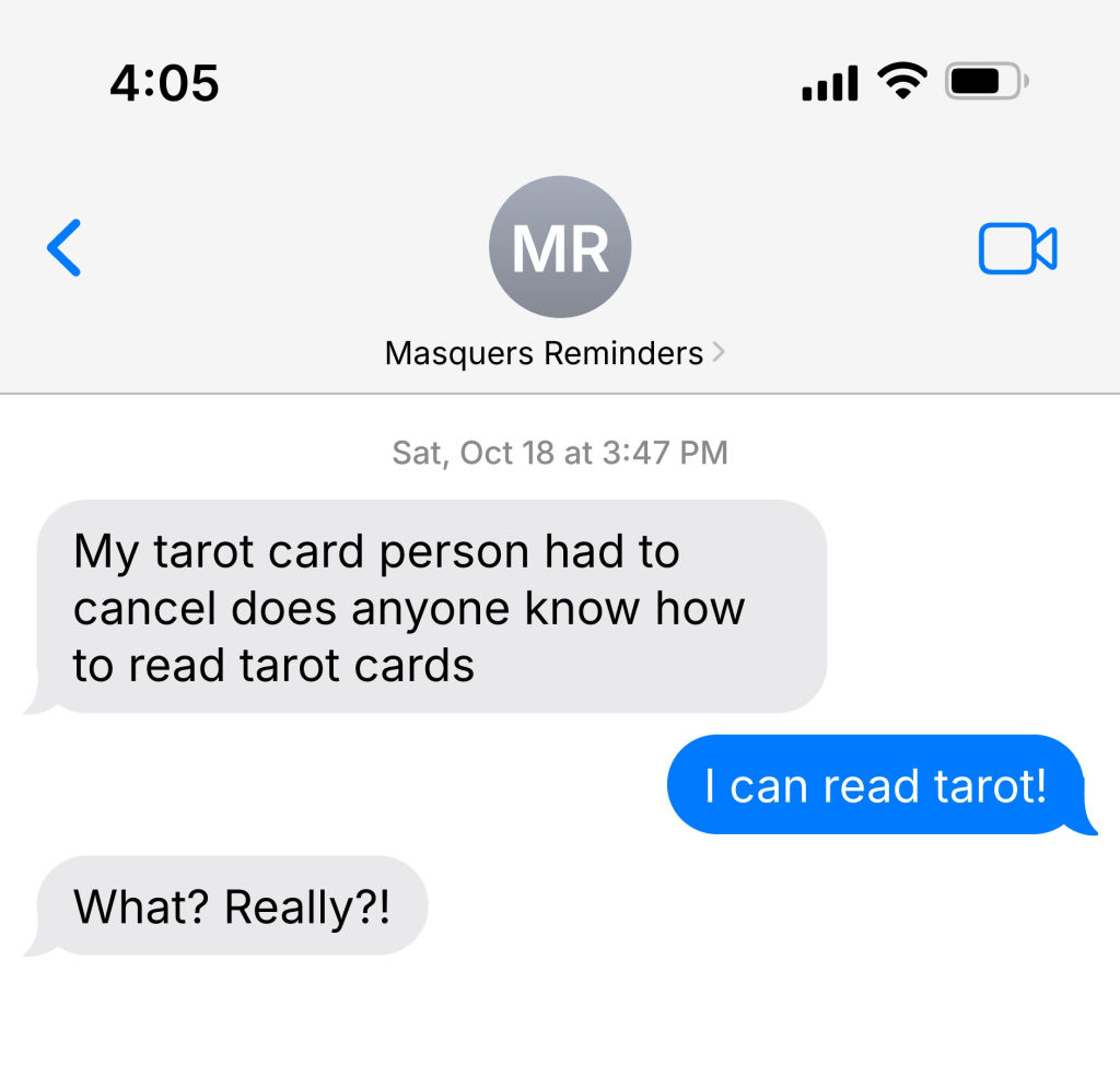 This text came from the organizer of the annual Haunted Playground fundraiser for the North Reading High School drama club, the Masquers. It so happens I had picked up tarot card reading on a lark months before.